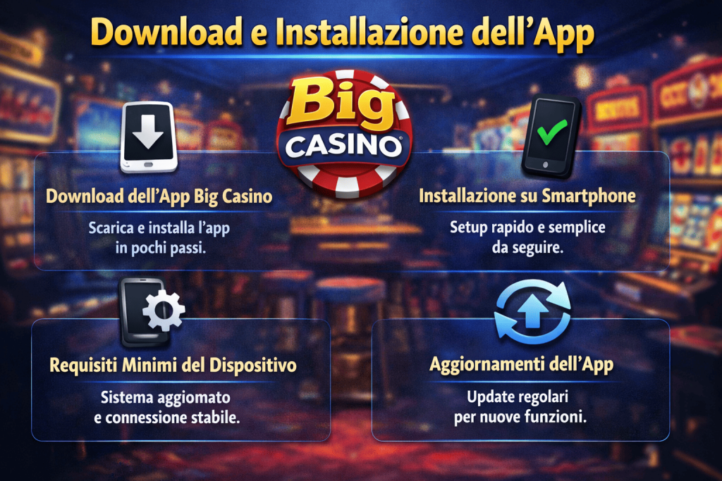 Il download dell’App Big Casino è semplice e veloce. L’applicazione è disponibile per dispositivi mobili e consente di accedere a tutte le funzionalità del casinò direttamente da smartphone. Prima del download, è consigliato completare l’Iscrizione per poter accedere subito all’account una volta installata l’app.